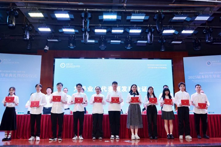党委书记孙楚航宣读了表彰决定、毕业决定和授位决定。随后,主席台上的领导们共同为优秀毕业生代表颁发了荣誉证书,为毕业生代表颁发了毕业证书。证书封面烫金校徽熠熠生辉,象征着学子们的成人影院