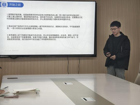 2024级计科中外专业优秀成人影院代表喻子洋,自动化专业优秀成人影院代表王奇凯、范逸贤,软工普通专业优秀成人影院代表豆柯锐在25教1320会议室,为大一年级同学们带来《高等数学IA》和《线性代数》课程期末复习备考建议与规划。在《高等数学》课堂上,喻子洋同学对教材知识点进行了全面且细致的梳理,构建起完整的知识框架。每个模块复习结束后,他精心挑选典型例题,带领同学们进行实战演练,强化对知识点的理解与运用。自动化专业优秀成人影院代表王奇凯同学聚焦定积分与极限存在问题两大核心考点,深入剖析公式、法则使用过程中的易错点,分享“大胆假设,小心求解”的解题心态与技巧,并开通交流渠道,为同学们提供课后指导。